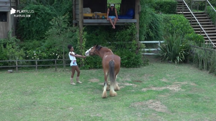 O cavalo é o xodó dos participantes de A Fazenda . E, na manhã desta segunda-feira (9), Sabrina Paiva brincou com Lyon na área externa da sede.